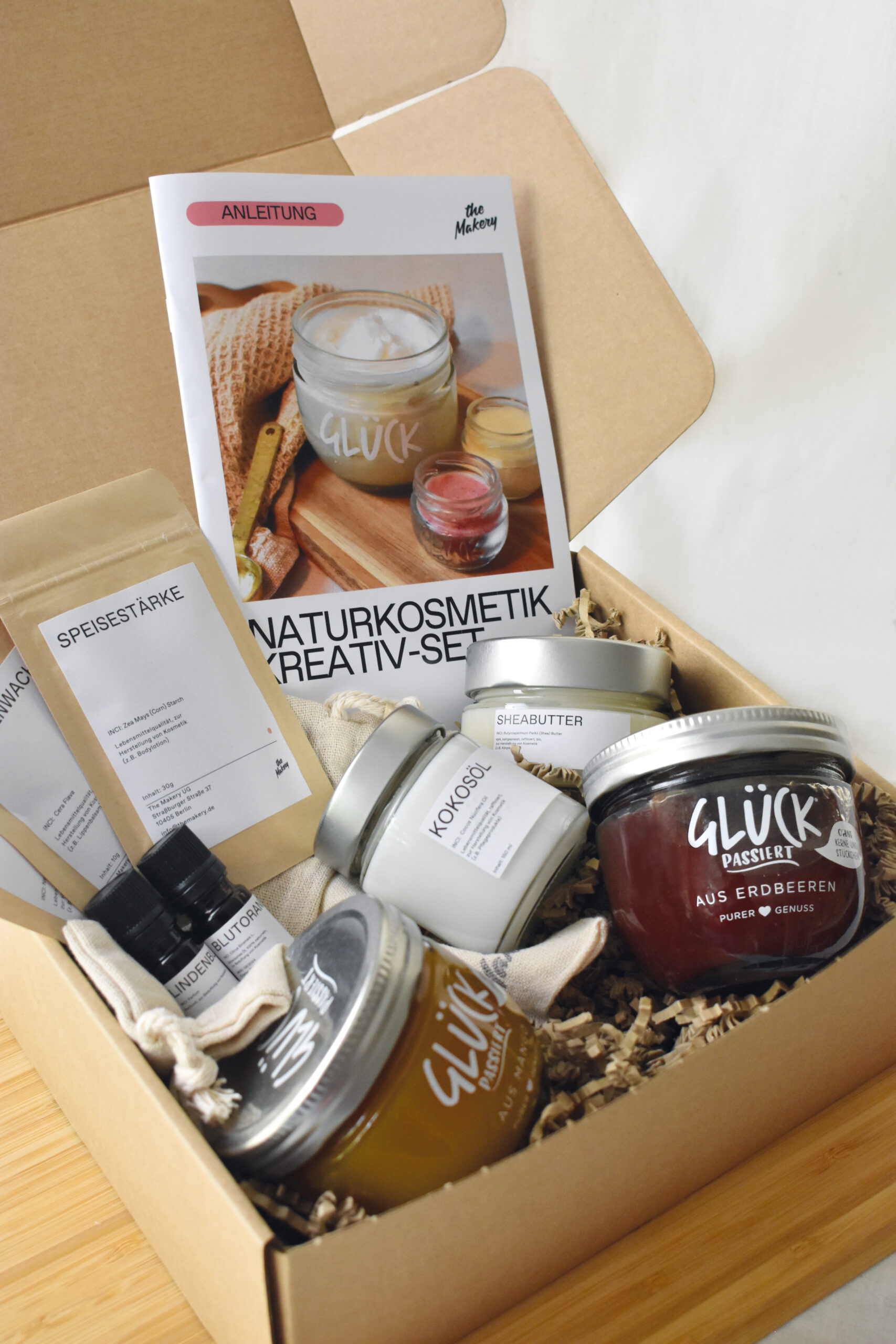 Die GLÜCK-Gläser sind perfekt geeignet um Cremes, Deo sowie Lipbalm gut geschützt aufzubewahren bzw. abzufüllen. The Makery hat als DIY-Profi das nötige Know-How für die eigene Herstellung von Naturkosmetik. Dieses wird zusammen mit zwei GLÜCK-Marmeladengläsern, in Normalgröße, sowie vier Mal den Mini-Versionen der Konfitüre im Kreativ-Set mitgeliefert. Außerdem befindet sich darin Kokosöl, Sheabutter, Bienenwachs, Stärke und Natron. Die DIY-Naturkosmetik soll natürlich auch einen feinen Duft mit sich bringen. Deswegen sind außerdem die Düfte Blutorange und Lindenblüte sowie Hibiskuspulver mit im Paket. Wie es sich für Naturkosmetik gehört, sind alle Zutaten natürlichen Ursprungs.